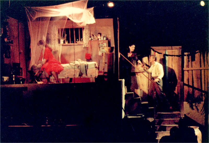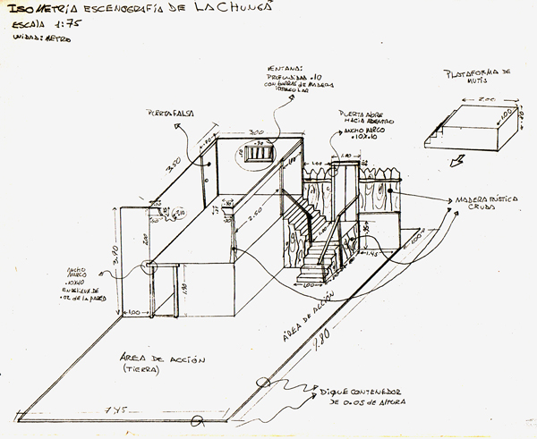 "La Chunga", de Mario Vargas Llosa, dirigida por Bonnie Morín. Diseño y realización de la escenografía e iluminación por Cristián Velarde. El montaje fué realizado en 1989 en Caracas en el teatro Rajatablas.